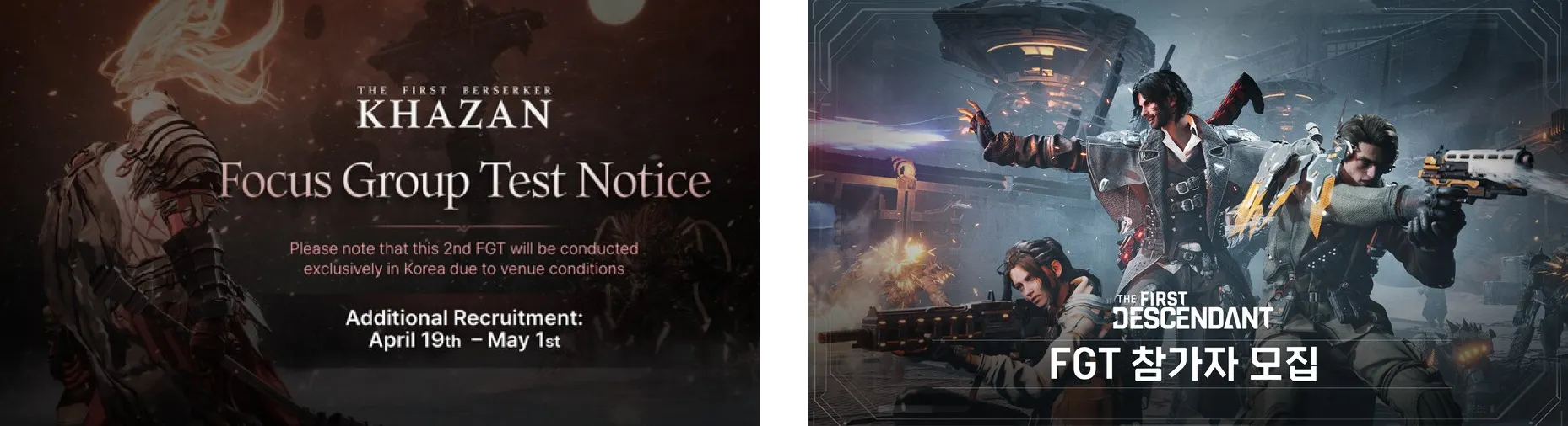 그림 2: FGT(Focus Group Test) 테스터 모집 안내 이미지 (좌: 퍼스트 버서커: 카잔 / 우: 퍼스트 디센던트)