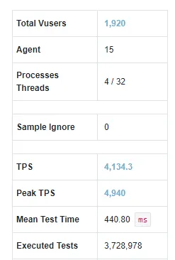 nGrinder 에이전트 15대에서 생성된 1,920명의 가상 사용자가 15분 동안 NXCommand 서비스에 get_gc_all_by_guid 명령어를 무제한으로 호출합니다. 모든 가상 사용자가 보내는 호출 정보는 동일합니다.