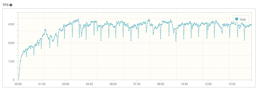 15대의 nGrinder 에이전트에서 1,920명의 유저가 15분 동안 호출한 결과, 총 3,728,978건의 호출이 발생했으며, TPS는 평균 4,134건, 최대 4,940건으로 집계되었습니다. 그림 17은 15분 동안 가해진 호출의 TPS 추이를 나타냅니다.