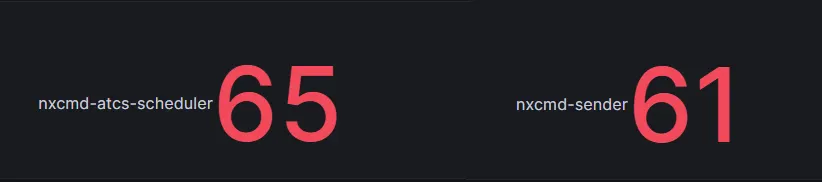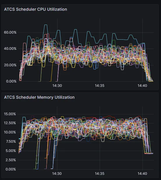 부하가 가해지는 상황 속에서 ATCS 스케줄러와 NXCommand 서버는 그림 19와 같이 처음 9대에서 각각 65대와 61대까지 파드 수가 점진적으로 증가하였습니다.
