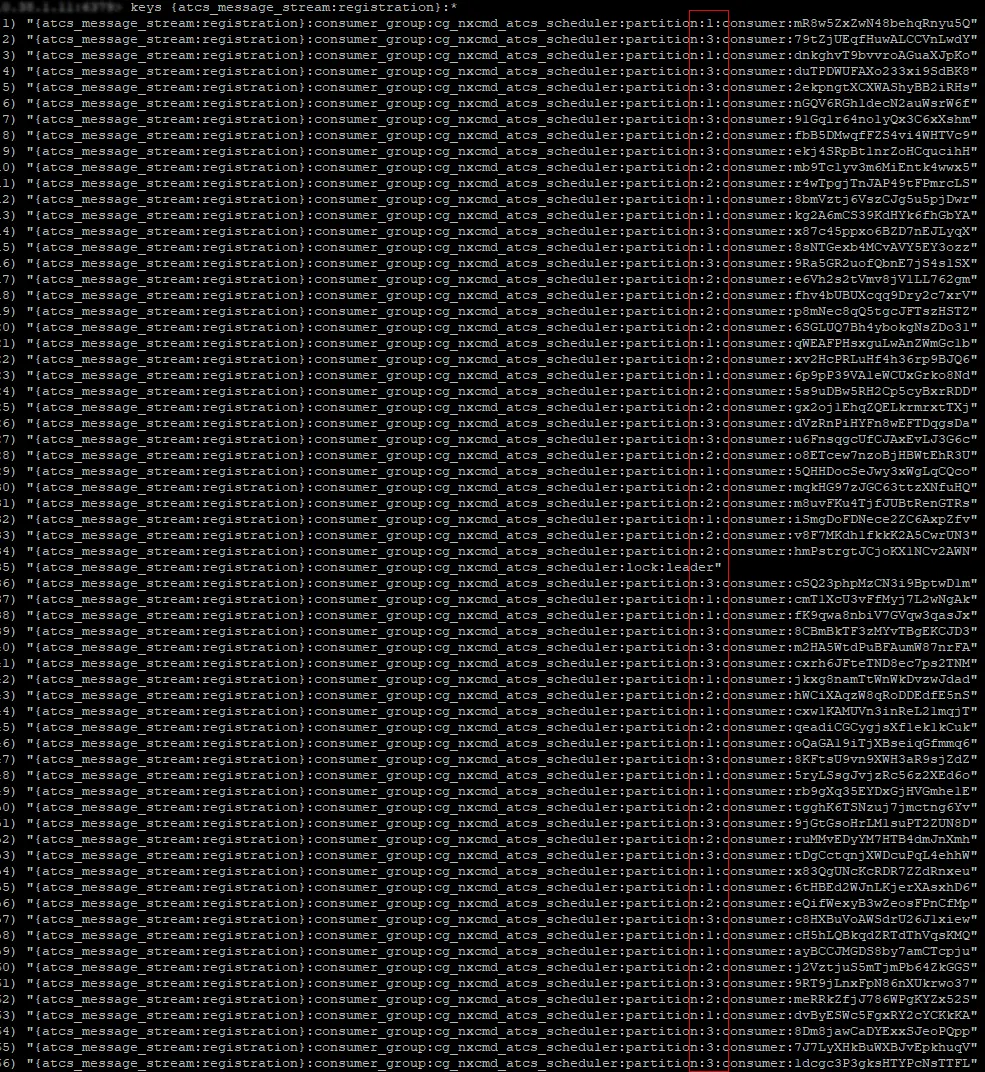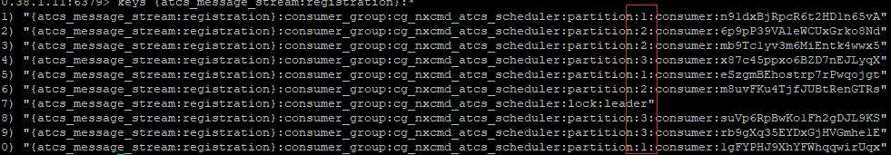 쿠버네티스의 서비스 파드가 부하를 감당할 수 있는 수준까지 스케일 아웃이 진행된 시점에, Redis의 KEYS 명령어를 호출하여 ATCS 메시지 등록 스트림에 속한 컨슈머들이 할당된 파티션 목록을 조회한 결과는 그림 20과 같습니다.