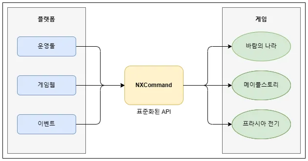 게임 운영도구, 게임 웹 그리고 게임 이벤트와 같은 플랫폼이 프라시아 전기, 마비노기 그리고 바람의나라와 같은 게임을 대상으로 “사용자 정보 조회”, “사용자 쿠폰 지급”과 같은 명령어를 호출하기 위해 일대일 (1:1) 방식의 개별 연동으로 인해 중복 작업이 다수 발생하였습니다. 이러한 문제를 해결하기 위해 NXCommand 서비스가 등장하였습니다. NXCommand 서비스를 통해 플랫폼과 게임은 서로 다대다 (N:N) 방식의 기존 연동을 쉽게 일대다 (1:N) 방식의 연동으로 전환할 수 있으며, 개별 연동에서 발생하는 중복 작업을 최소화합니다.