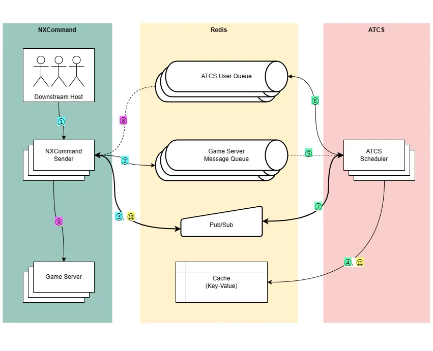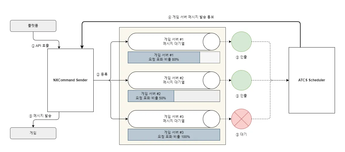 NXCommand 발송 서버가 ① 수신한 요청 메시지는 ② 해당 게임 서버의 전용 대기열에 등록되며, ATCS 스케줄러는 게임 서버 별 스케줄링 정책에 따라 ③ 처리 가능한 경우 대기열에서 메시지를 인출하여 ④ NXCommand 발송 서버에게 발송 통보를 수행할 수 있습니다. 그렇게 전달받은 메시지를 NXCommand 발송 서버는 ⑤ 게임 서버에 발송합니다.