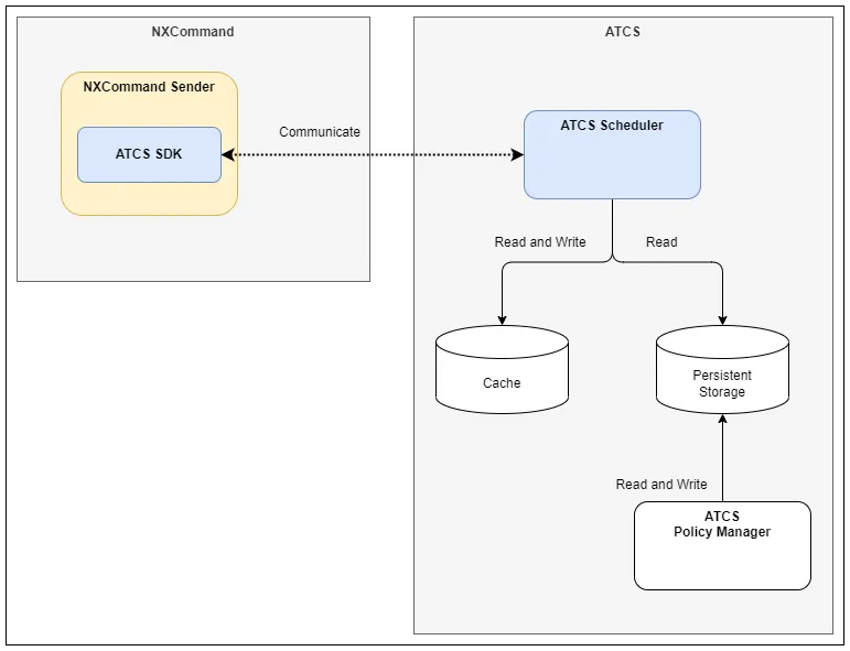 ATCS는 요청 메시지를 대기열에 등록하는 ATCS SDK와 게임 서버의 대기열을 관리하는 ATCS 스케줄러, 그리고 게임 서버 별 허용 가능한 트래픽을 동적으로 제어하는 ATCS 정책 관리자로 구성되어 있습니다. 그림 6은 ATCS의 구성요소를 도식화한 것을 나타냅니다.
