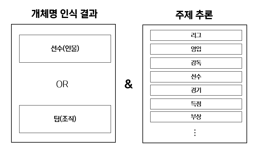 이 중에서 Zero-Shot Learning, Named Entity Recognition 두 가지 방안을 선택했고, 구체적으로 어떤 방식으로 필터링할지 고민해본 결과, 뉴스 기사의 텍스트 데이터를 통해 선수/팀/구단/감독 등의 개체명을 인식하고, 뉴스 주제를 분류하여 저희가 생각한 가설에 일치하지 않은 경우 불필요한 뉴스로 추정했습니다.