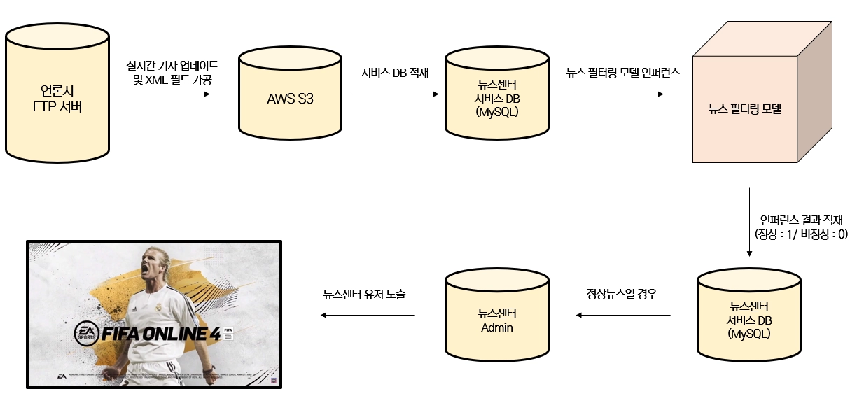 언론사의 FTP 서버를 통해 실시간으로 제공되는 뉴스 기사 중 필요한 필드를 S3에 적재한 후에 서비스 DB로 가져온 뒤 위에 생성된 필터링 모델을 통해 결과를 추론합니다. 결과 추론 결과 정상 뉴스/비정상 뉴스로 이진 분류(1/0)를 진행하는데, 정상 뉴스인 경우(SORT=1)에만 어드민 페이지를 통해 동기화를 진행합니다.