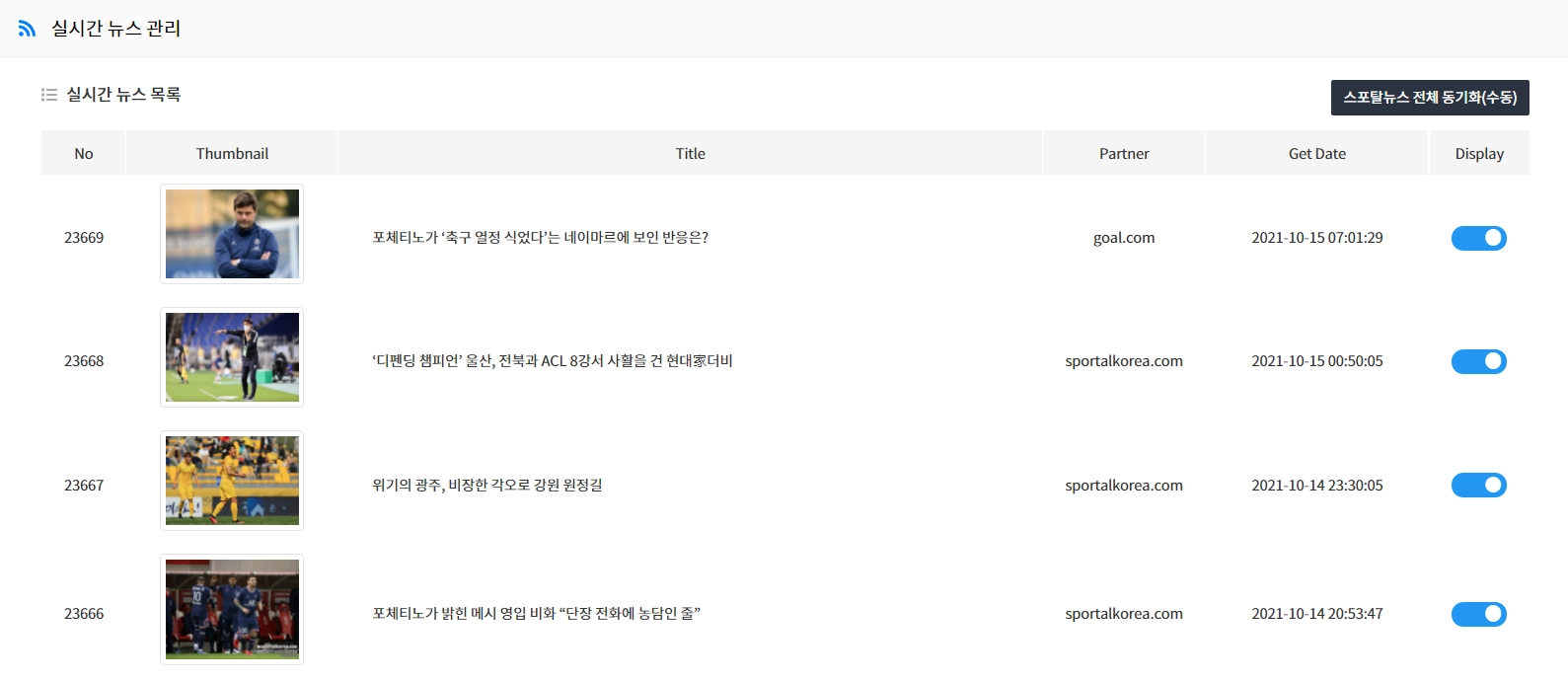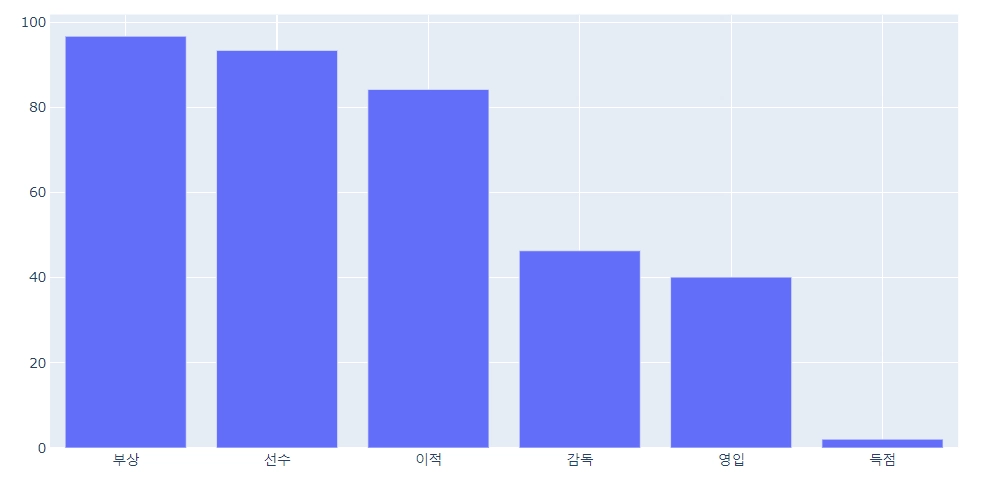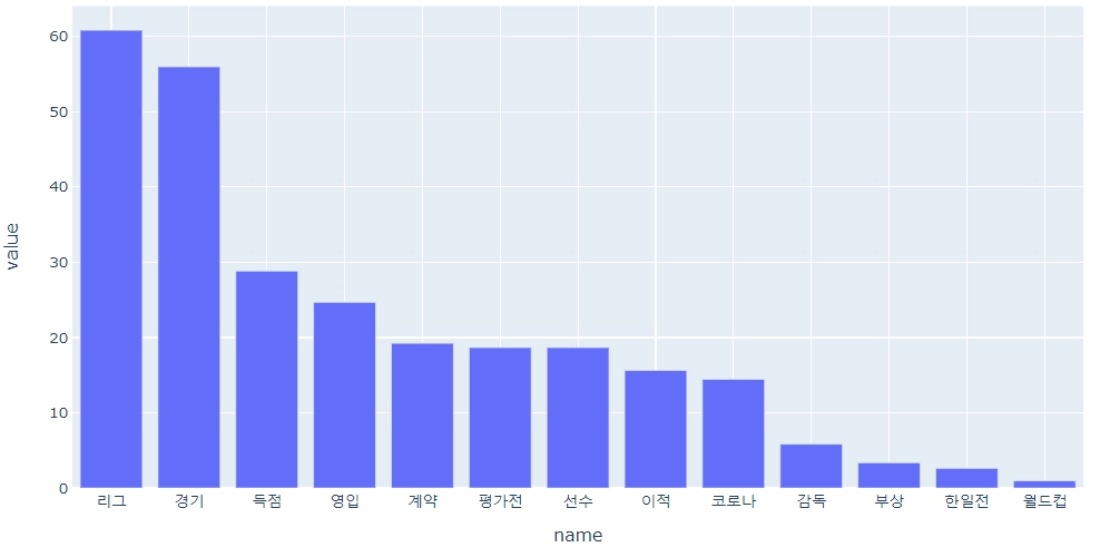 → ('리그','영입','감독','선수','경기','득점','부상', '한일전','월드컵'','평가전','이적','계약') |