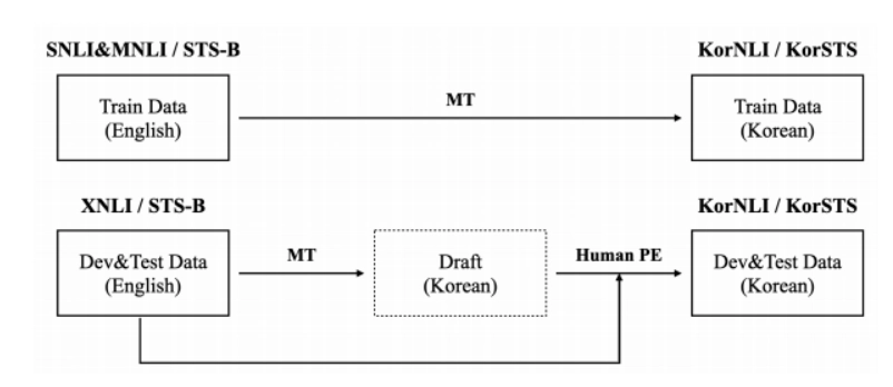 1. KorNLI and KorSTS (기존 영문 데이터셋을 기계번역한 데이터셋) - 개발과 테스트셋의 번역 결과에 대한 평가 퀄리티를 보장하기 위해 전문 번역가에게 사후 평가