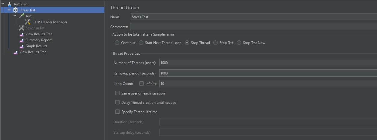 Ramp-Up Period (seconds): 스레드를 Ramp-Up Period 시간 동안 실행. 예를 들어, Number of Thread가 10인데, Ramp-Up Period가 60이면, 스레드가 약 6초 간격으로 동작합니다.