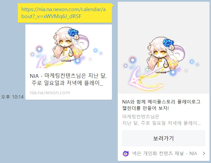 NIA 메이플스토리 플레이로그 캘린더 서비스는 유저가 서비스에 접근할 때마다, 메이플스토리 대표 캐릭터의 코디, 레벨, 랭킹 등의 정보를 실시간으로 조회하여 캘린더 이미지를 생성합니다.