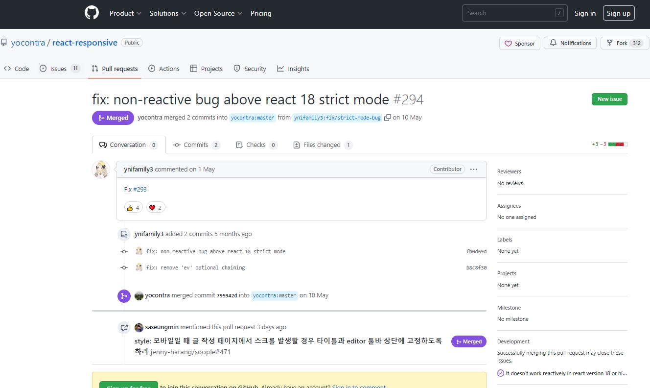 개발 초기에는 반응형 레이아웃을 감지할 때 react-responsive를 사용하였으나, 개발 환경에서 반응형 대응이 제대로 되지 않아서 이슈를 발행하였고, 버그를 찾아 직접 수정하여 오픈소스에 기여하기도 했습니다.