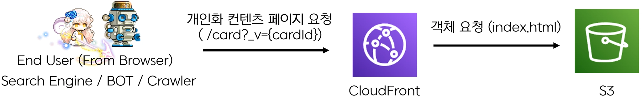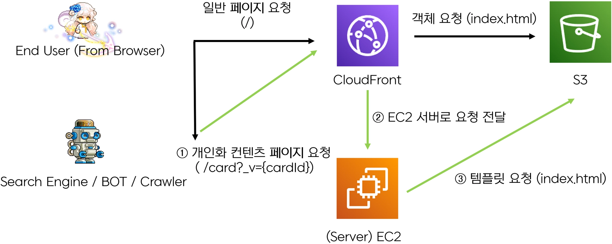 엔드포인트 요청이 개인화 컨텐츠 면 개인화된 URL 메타정보를 추가로 얻어올 수 있도록 하였습니다. 그 외의 페이지에서는 그대로 web root (index.html) 파일을 전달해주기 위해 위와 같은 컨텐츠 요청 흐름을 설계하였습니다. EC2 서버에서는 User Agent를 분석하여 일반 사용자가 브라우저로 접속하였다면 평소대로 index.html 컨텐츠를 돌려주고, 봇이라면 추가적인 연산을 통해 개인화 컨텐츠를 가져와 <meta> 태그에 부착하여 돌려주게 됩니다.
