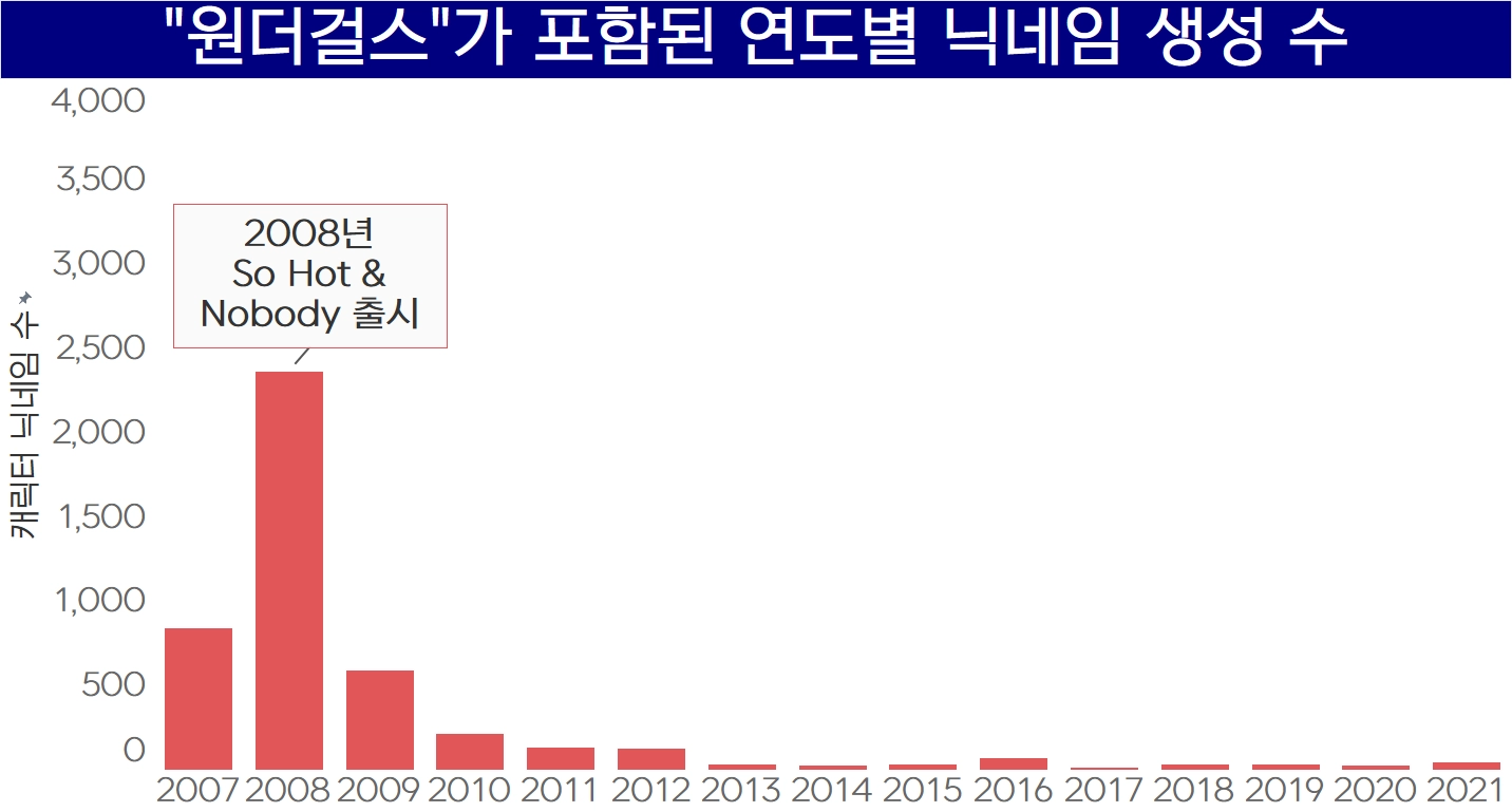 2008년, 원더걸스: So Hot, Nobody까지! 2008년은 원더걸스의 해라고 해도 무방한데요. 원더걸스와 관련된 닉네임은 역시 원더걸스 원톱이었던 2008년에 가장 많이 생성된 것으로 확인됩니다.