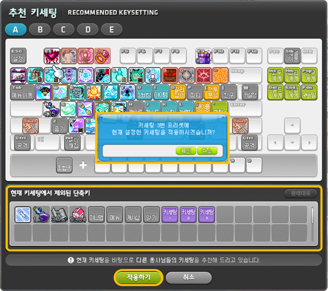 추천 받은 키세팅은 “적용하기” 기능을 통해 가져올 수 있으며, 이 과정에서 개인의 취향에 맞게 스킬이나 아이템의 위치를 수정할 수도 있습니다.