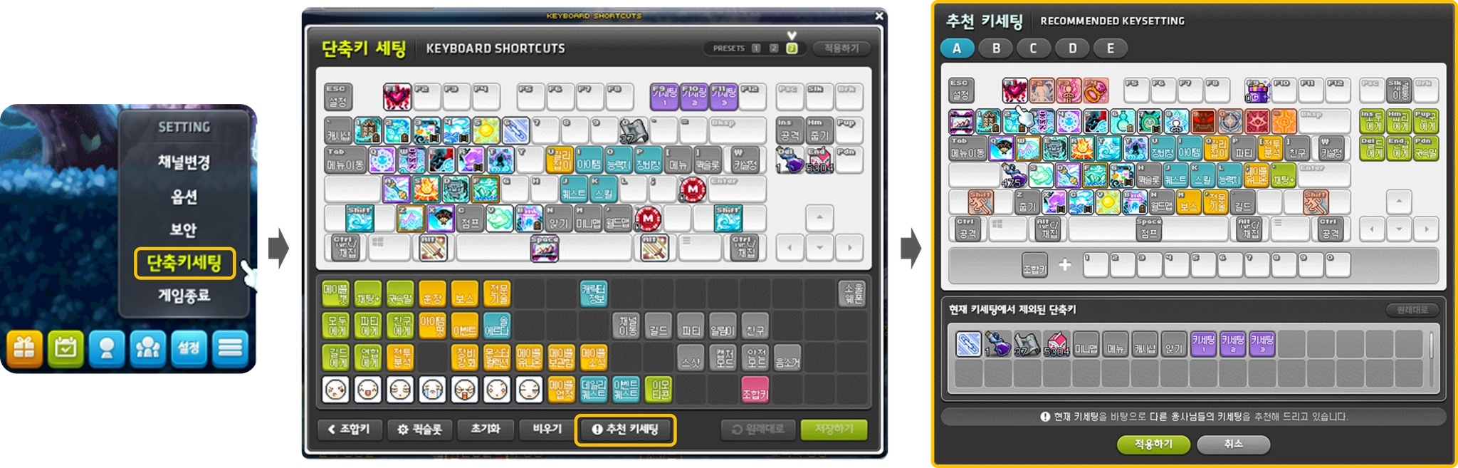 추천 키세팅은 200레벨 이상 5차 전직을 완료한 경우, <설정 → 단축키 세팅 → 추천 키세팅>을 통해 확인해 볼 수 있습니다.