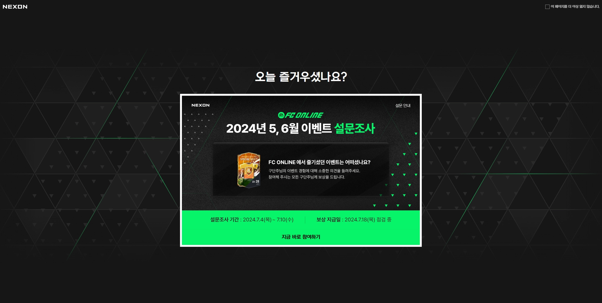 예시의 두 사진은 각각 넥슨 홈페이지 로그인 직후와 게임 종료 직후에 CEM을 통해서 노출되는 화면을 캡처한 것입니다.
