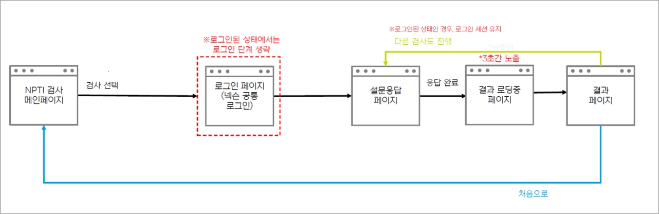 이렇게 만들어진 NPTI 이벤트 Flow는 다음과 같습니다. 테스트는 총 두 가지로 이루어져 있는데요. 첫째, 나랑 비슷한 성격의 넥슨 캐릭터 찾기(개인 성격)와 둘째, 나랑 비슷한 게임 성향의 게임 속 직업 찾기였습니다. 유저는 이 두 가지 테스트를 진행한 후 각자 자신의 NPTI 타입을 확인할 수 있게 됩니다.
