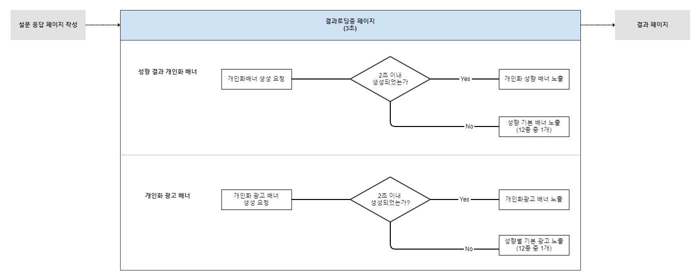 이때 템플릿은 성향별 게임 추천 배너와 주 게임 콘텐츠를 추천해주는 개인화 배너 두 가지로 분류합니다. 그리고 유저가 설문을 진행하고 결과를 확인하기 전 로딩 단계에서 해당 배너를 실시간으로 생성합니다. 바로 아래와 같은 flow를 타고 말이죠.