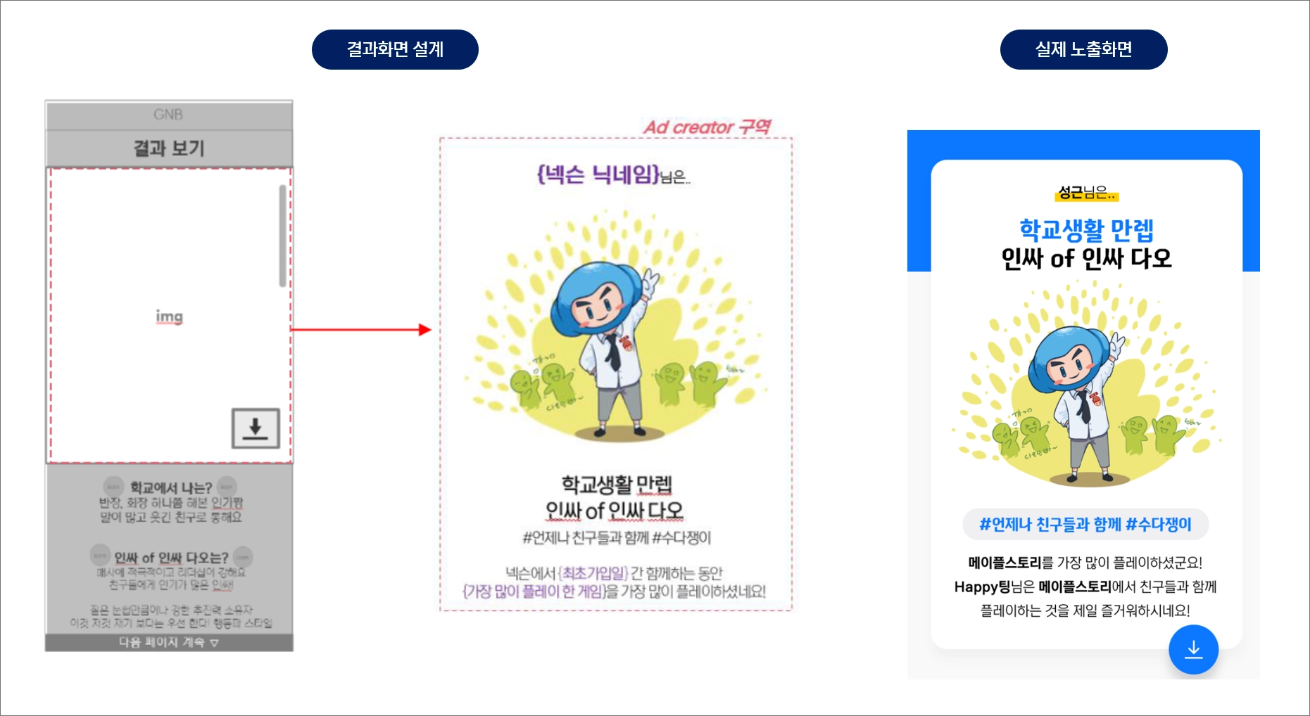 이때 단순하게 유저 닉네임만 변경해서 캐릭터 매칭 결과를 노출하기 보다 유저에 대한 정보를 조금 더 추가해서 보여준다면 더욱 특별하게 느껴지지 않을까요? 그래서 우리는 유저가 플레이를 자주 하는 주게임 정보와 가입일, 플레이 타임 등의 개인화 정보를 AD Creator로 만들어 노출했습니다.