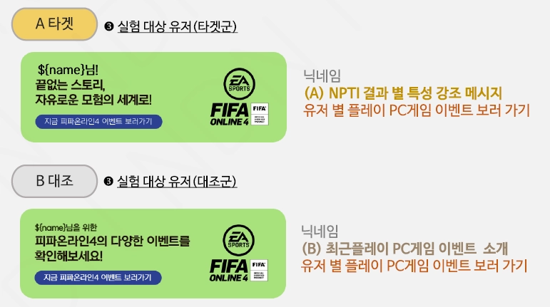 피파온라인4를 즐겨 하는 유저의 결과 페이지에는 피파온라인4에서 진행하고 있는 이벤트를 추천하고 복귀 또는 신규 유저에겐 NPTI 유저 성향에 맞는 다른 게임을 추천하는 것이죠.