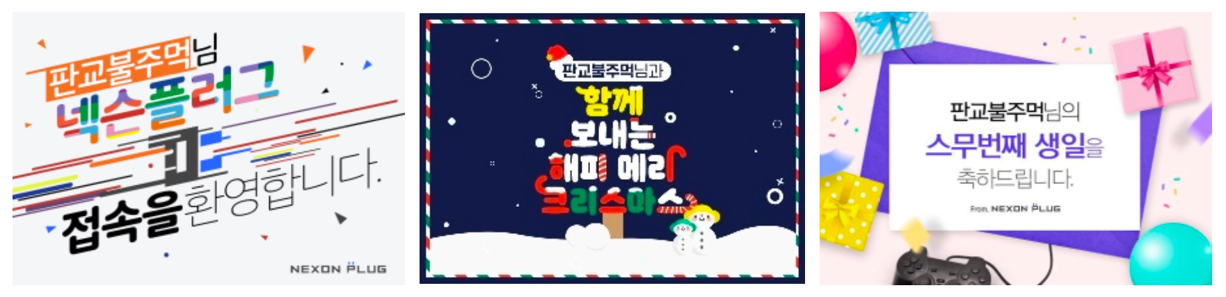 개인화 배너는 이벤트 뿐 아니라 특정 영역에는 상시로 운영할 수도 있습니다. 현재 넥슨플러그 시작 스플래시 이미지로 AD Creator로 제작한 개인화 배너를 상시 운영 중에 있는데요. 유저의 조건에 따라 개인화 배너가 노출되도록 프로세스를 구성하였으며, 이를 통해 유저는 생일이나 기념일 등에본인의 닉네임이 포함된 개인화된 배너를 확인할 수 있습니다.