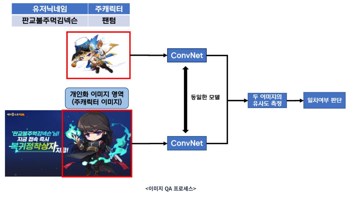 셋째, 추출된 개인화 이미지가 유저의 주 캐릭터 이미지와 일치하는지 체크합니다. 일치하지 않는다면 유저 닉네임과 함께 불일치 결과를 로그에 남깁니다.