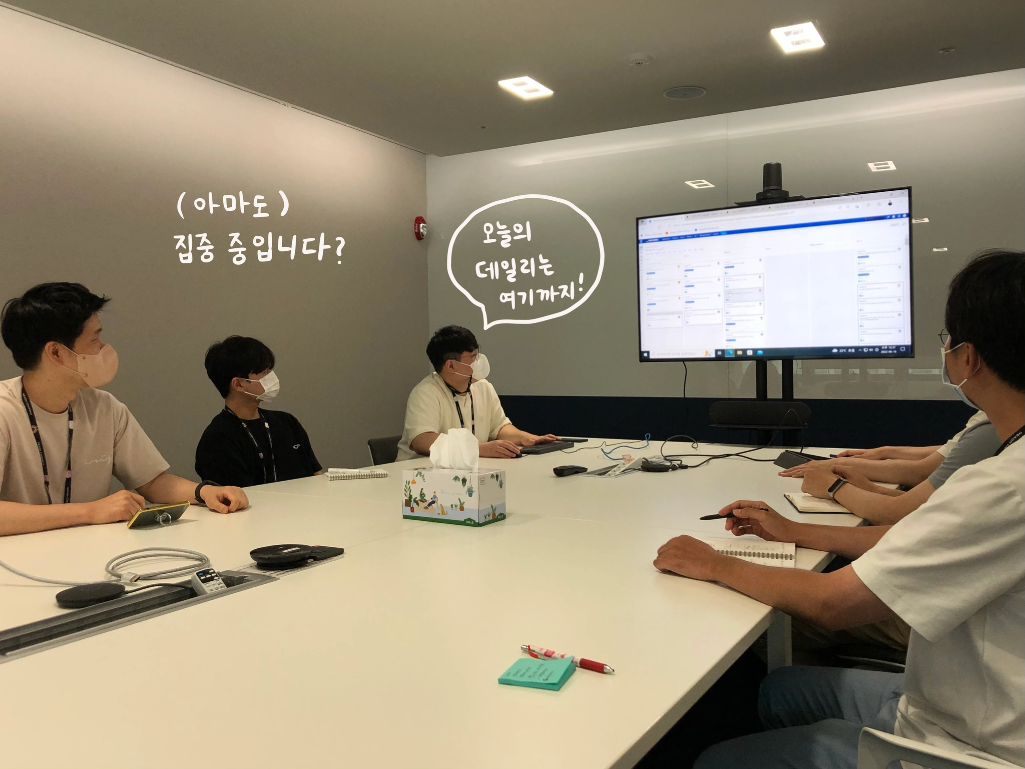 업무의 진행 상태와 업무를 진행하면서 느꼈던 어려운 점에 대해서 자유롭게 공유하는 팀 문화 중 하나인데요. 작업 진행 중 막혀있는 부분에 대해서 팀원분들께 도움을 받을 수 있어 제가 좋아하는 시간이기도 합니다.