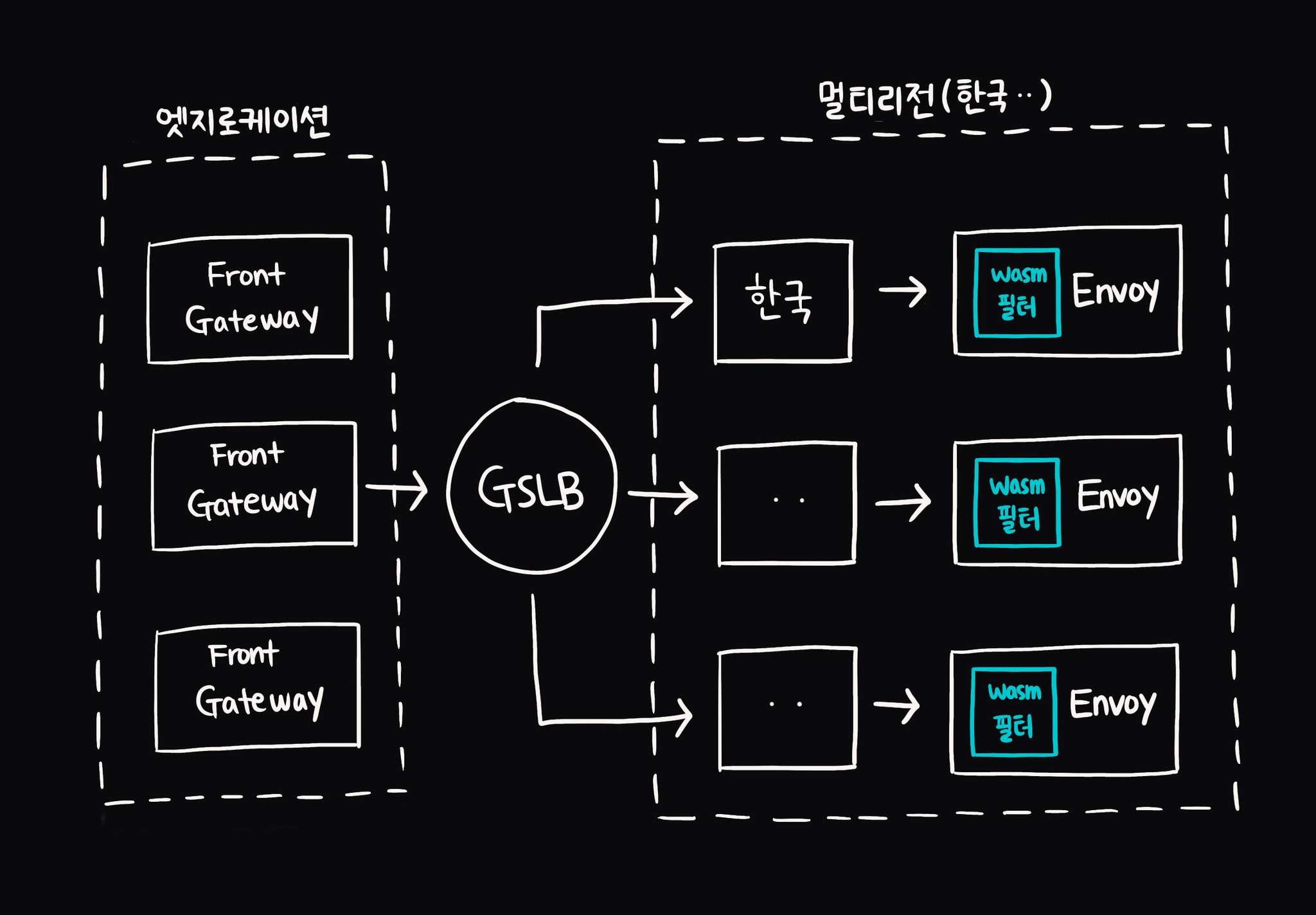 Internal Gateway: 일반적인 API Gateway의 기능을 제공함과 동시에 GSLB를 사용하여 특정 리전 전체가 다운되더라도 잠깐의 다운 타임 후 트래픽을 우회할 수 있도록 설계되었습니다.