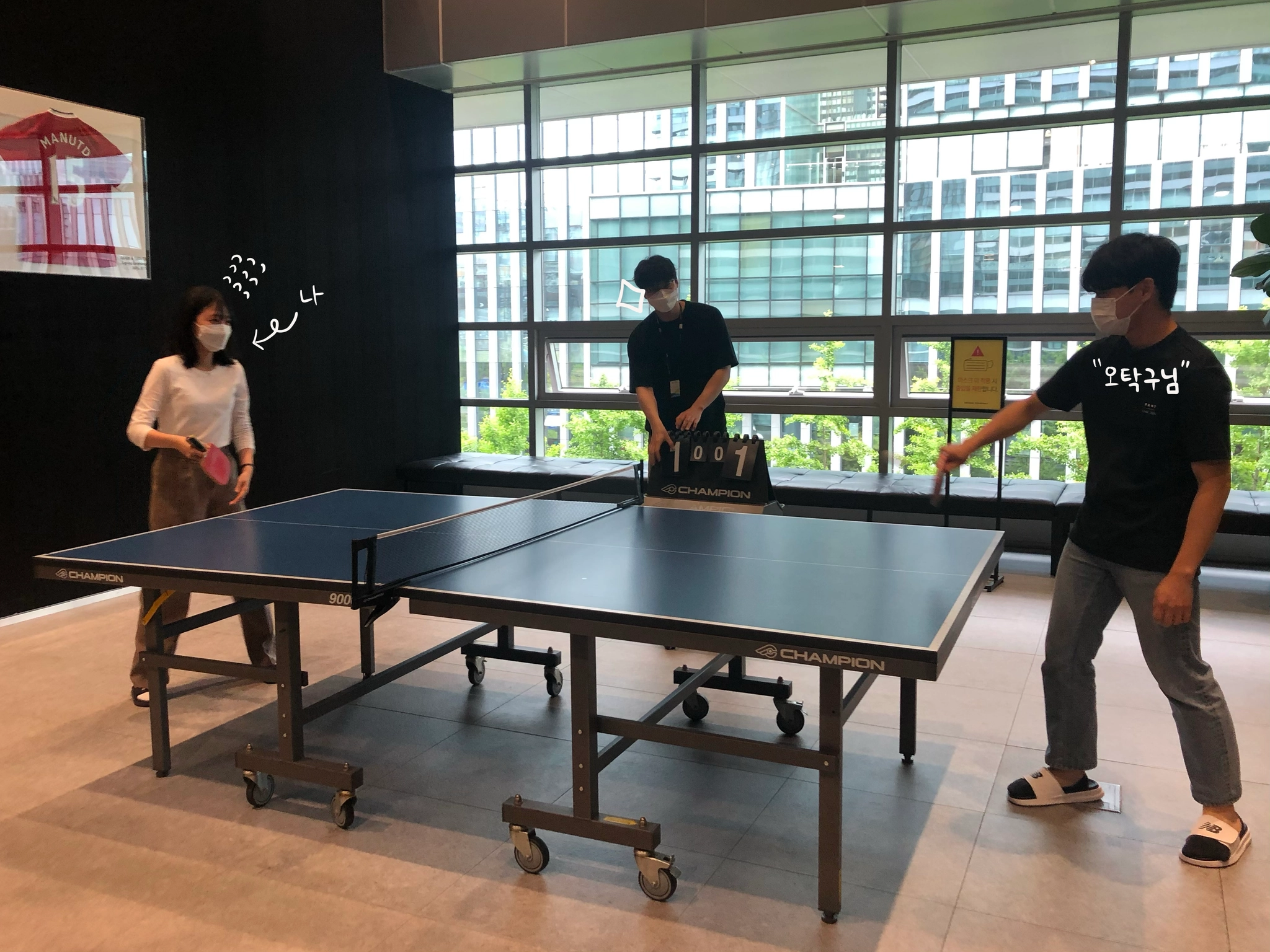 오늘의 운동은 탁구! 사원증까지 벗어던지고 접전 끝에 오탁구님을 이겼습니다!!