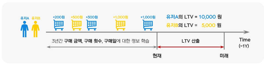 위 그림은 유저 A와 B의 LTV를 산출하는 방식을 보여줍니다.