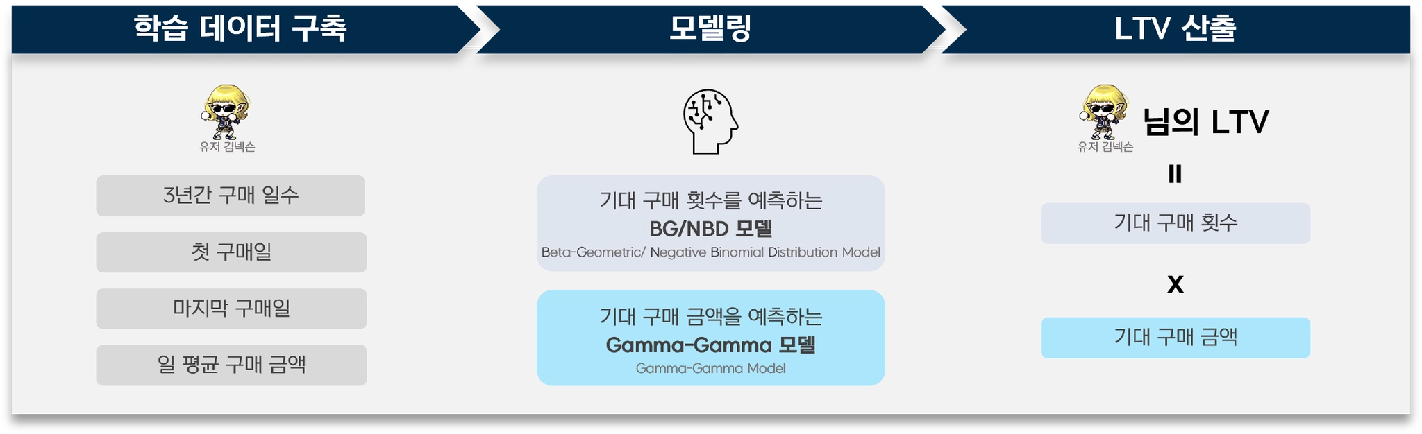 LTV는 유저의 과거 구매 정보를 가지고 기대 구매 횟수와 기대 구매 금액을 예측해 이 둘의 곱으로 산출되는 지표입니다.