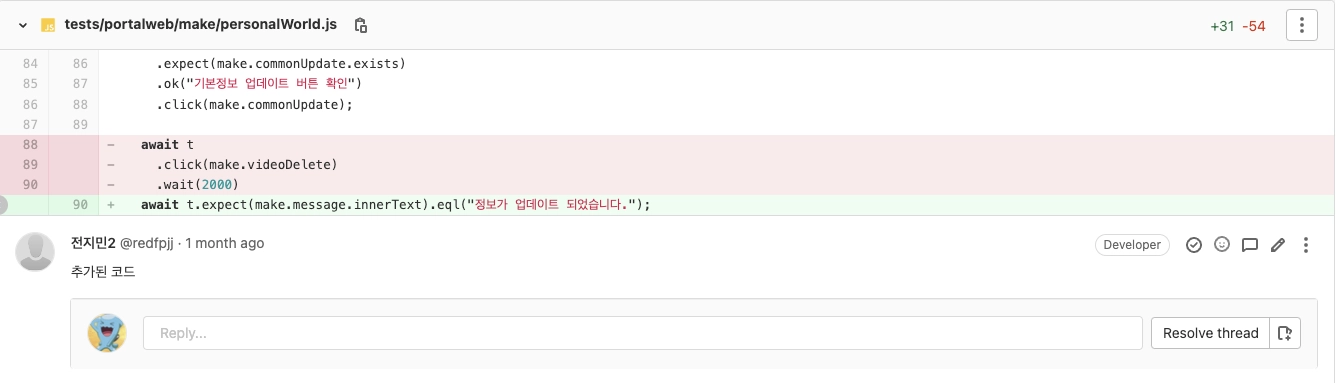 현재는 테스트 코드 자체의 에러나 버그를 함께 살펴보기 위해 개발자가 MR(Merge Request)을 보며 같이 리뷰하며 고쳐가고 있습니다. 곧 소개하겠지만, 라이브러리 자체 버그나 모킹(mocking)된 환경에서 발생하는 cors에러 등의 이슈 같은 문제가 아니라면 점차 QA에서 보다 주도적으로 테스트 코드를 작성하실 수 있으리라 봅니다.