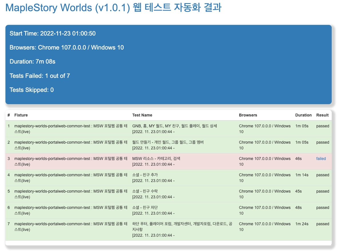TestCafe에서 제공하는 기능으로 메이플스토리월드 포털웹, 개발자 센터, 포럼을 대상으로 테스트 코드 초안을 작성했습니다.