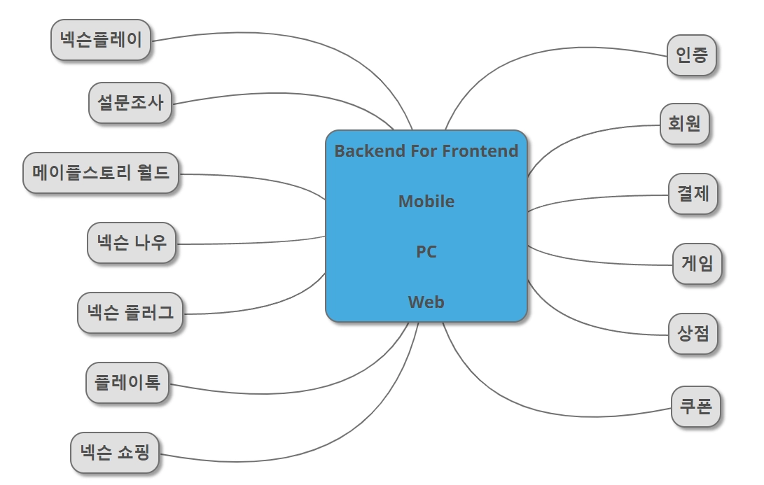 → 넥슨의 다양한 서비스에 기반이 되는 플랫폼(회원, 인증, 결제 등)과 이를 바탕으로 만들어지는 서비스(넥슨플레이, 메이플스토리 월드, 넥슨나우 등)와의 연결을 관장하고 기반 플랫폼과 서비스들은 각각의 분야에만 집중할 수 있게 한다.
