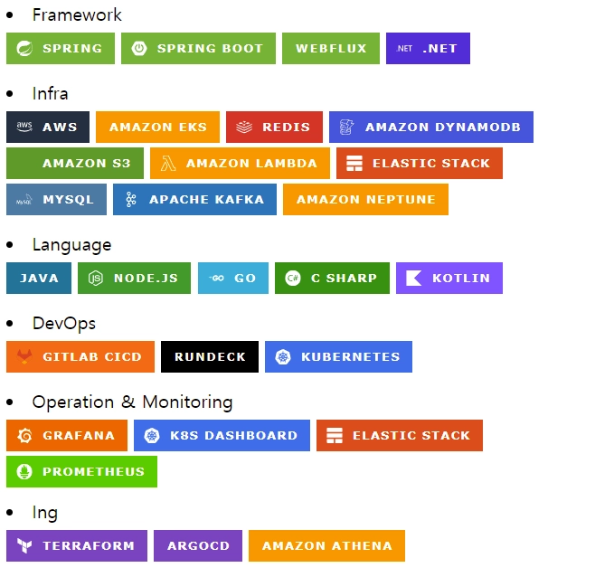 새로운 시스템에 대한 수요가 늘어나면서 우리의 시스템도 점점 다양해지고 있어요. 각각의 시스템에 적합한 기술 스택을 선정하고 최고의 효과를 내는 것을 목표로 하고 있기에, 다양한 기술들을 활용하고 있죠. 팀 내 사용 중인 기술도 점차 확장되고 있는데, 시작은 Spring, .NET, MYSQL, Redis이었지만 지금은 아래와 같이 더 다양한 기술 스택을 사용하고 있습니다.