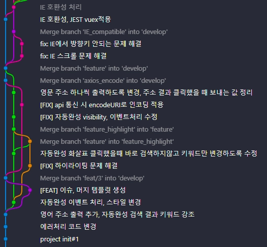 프론트웹개발팀에 들어와서 처음 하게 된 팀 프로젝트가 넥슨 주소찾기 프로젝트였어요. 당시엔 커밋 메시지의 중요성에 대해서도 무지했고, 어떤 방식으로 작성하는 것이 좋은지 잘 몰랐기에 이런 부분을 정리하지 않은 채로 각자 코드를 작성하고 로그를 남겼습니다. 그 결과는 다음과 같았습니다.