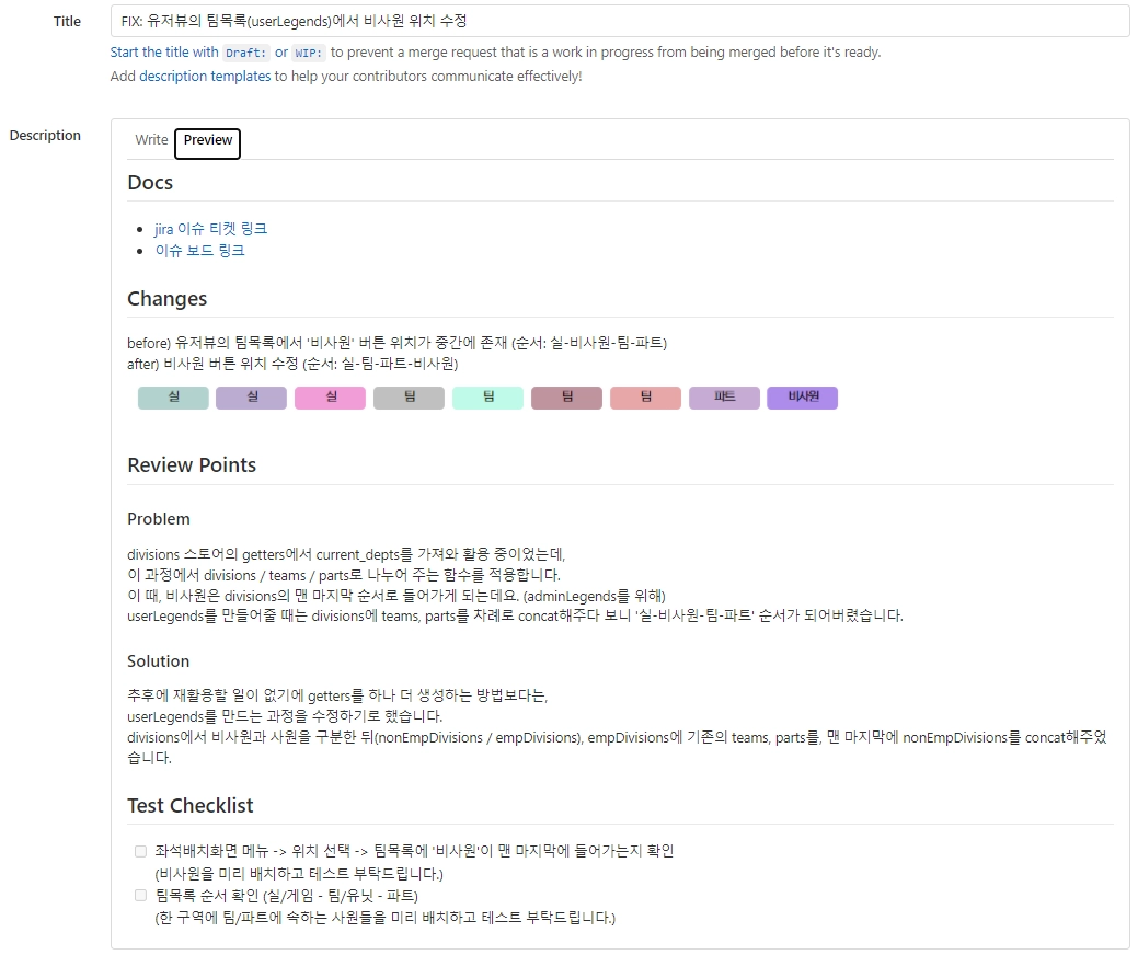 좋은 리뷰를 받으려면, MR의 description을 잘 써야겠다고 생각했습니다. 리뷰 받고 싶은 목록이나 변경점, 체크 리스트를 상세히 적어 리뷰어가 한눈에 볼 수 있도록 해야 하겠습니다.