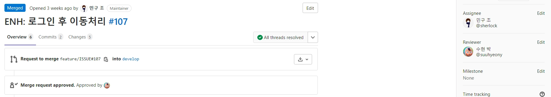 그림 9 : 코드리뷰 후 Approve 및 merge가 완료된 모습