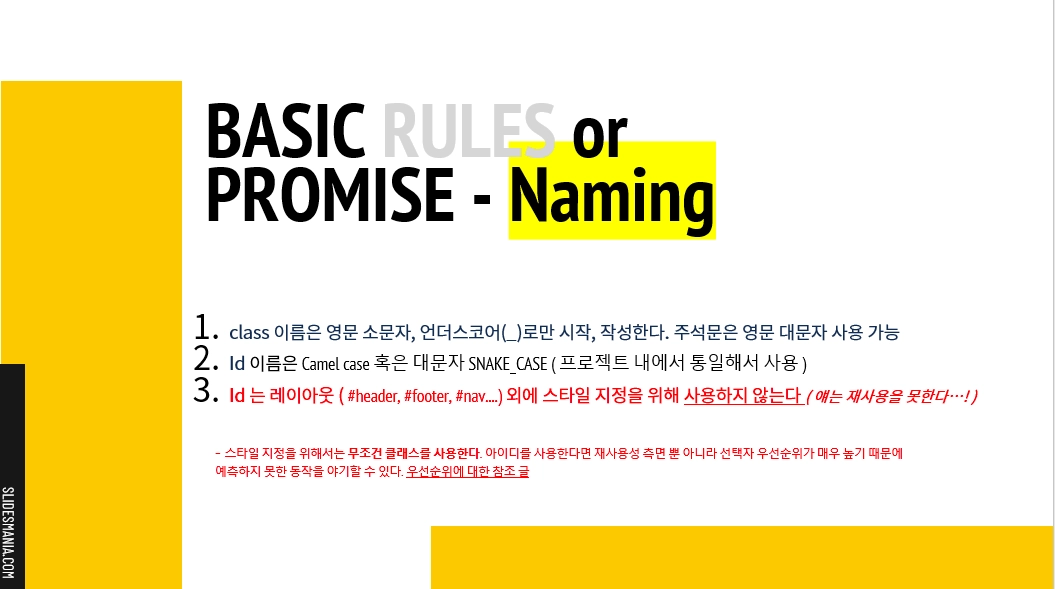 id와 class의 네이밍 방식을 다르게, 또 CSS와 JS의 네이밍 방식을 다르게 한다는 점이 인상깊었습니다.