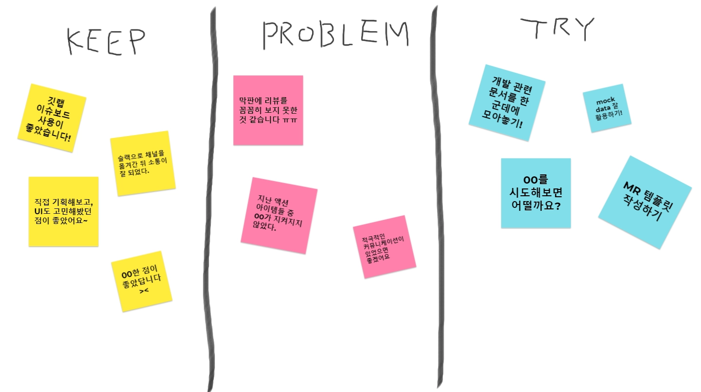 KEEP(계속 유지되어야할 것) / PROBLEM(문제점) / TRY(해결을 위해 시도할 것)