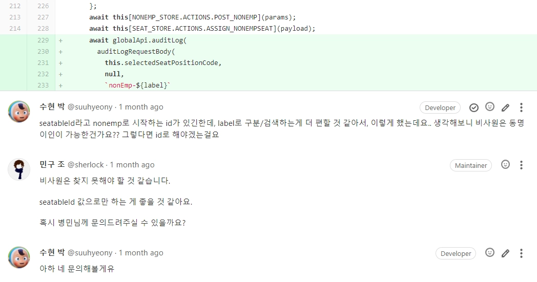 하지만 내가 맡지 않은 다른 부분의 코드도 보면서 차츰 프로젝트의 전반적인 코드를 파악하게 되었고 자연스레 숙련도가 높아지더라구요. (더불어 코드 리뷰 속도도 빨라졌다는 놀라운 사실..!)