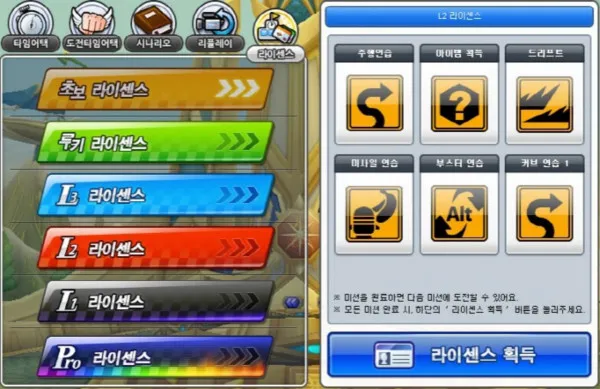 카트라이더에는 타임 어택, 대결 등 미션을 클리어하면 획득할 수 있는 라이센스 시스템이 존재합니다. 획득할 수 있는 라이센스 종류는 초보, 루키, L3, L2, L1, Pro가 있고, 라이센스의 획득 난이도는 나열 순서대로 높아집니다.