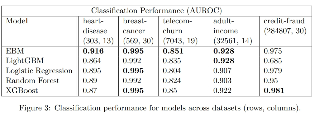 위 표는 5개의 공개 데이터셋에 EBM, LightGBM, 로지스틱 회귀, 랜덤 포리스트, XGBoost 분류 모델을 학습시킨 결과입니다. EBM은 높은 설명 가능성을 가지고 있음에도 불구하고, LightGBM, 랜덤 포리스트, XGboost같은 모델들과 동등한 수준의 성능을 보입니다.