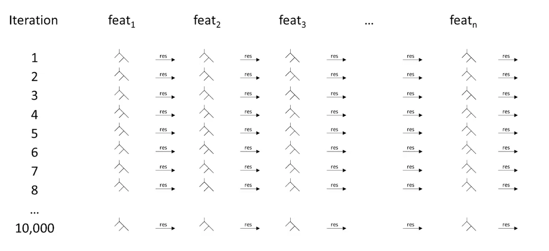 하지만 기존의 부스팅 기법과 다르게 1개의 트리는 1개의 feature만 사용할 수 있도록 제한됩니다. 또한 이전 트리 잔차를 예측하는 다음 트리는 아직 사용하지 않은 feature 1개를 사용하게 되고, 모든 feature를 트리 학습에 1번씩 사용하면 1번의 학습 사이클 종료된다는 점도 EBM 학습 알고리즘의 고유한 특징입니다.