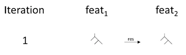 다음 decision tree는 첫 번째 decision tree의 잔차를 예측하도록 학습되고 이전에 사용되지 않은 feature (feat1이 아닌) 1개만 사용할 수 있습니다.
