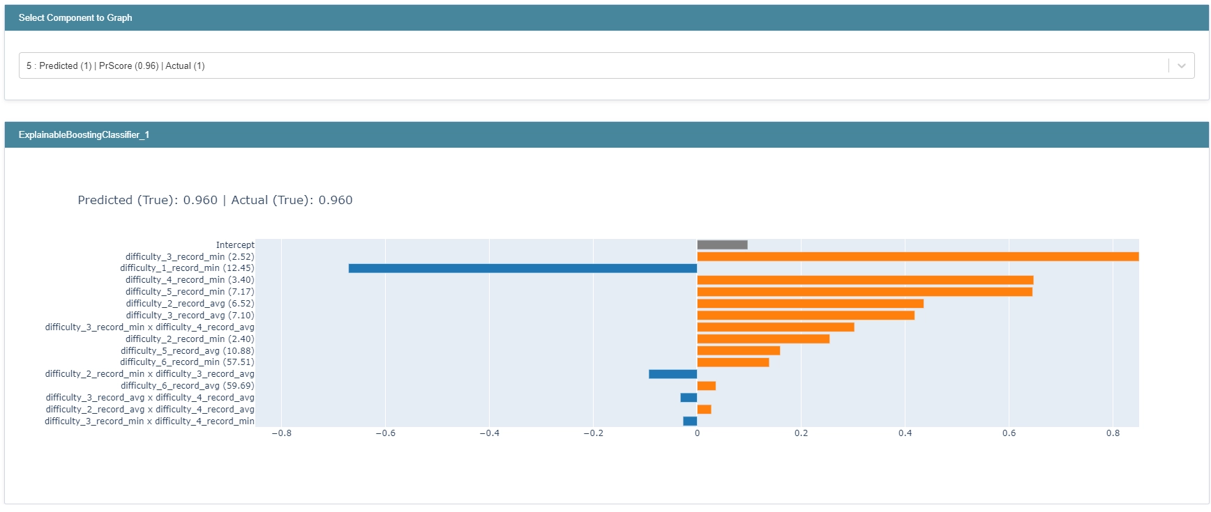 위 그래프는 입력된 데이터의 6번째 obs/row를 EBM 모델이 어떻게 추론했는지 보여줍니다. 그래프는 해당 obs/row의 로짓값 계산에 가장 큰 절댓값 기여를 한 feature, interaction 15개의 값을 보여줍니다.