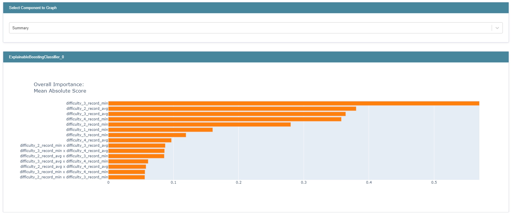 상단 드롭다운 메뉴를 이용해서 feature 별 feature function()을 확인할 수 있습니다. 위 그래프는 difficulty_3_record_min만을 사용하는 decision tree들을 lookup table로 대체한 결과입니다. 앞에서 설명해 드렸듯이 difficulty_3_record_min 값이 주어지면, 위 그래프를 이용해 값을 바로 계산합니다.