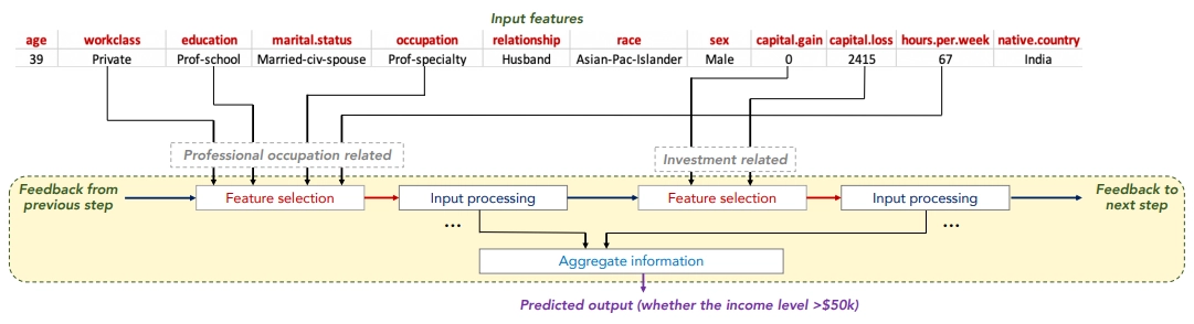 [그림 2]에서 나타나듯이 여러 단계(step)의 decision step을 거치면서 각 단계마다 feature selection mask를 구할 수 있습니다. 그래서 단계 별로 핵심 feature를 파악할 수도 있고, 단계 별 mask를 합하면 개별 입력 데이터에 대해서도 feature의 중요도를 파악할 수 있습니다. 이를 통해 instance-wise feature selection을 달성하고 local interpretability를 확보합니다. 당연히 각 mask를 전체 데이터에 대해 합하여 살펴볼 수도 있습니다(global interpretability).