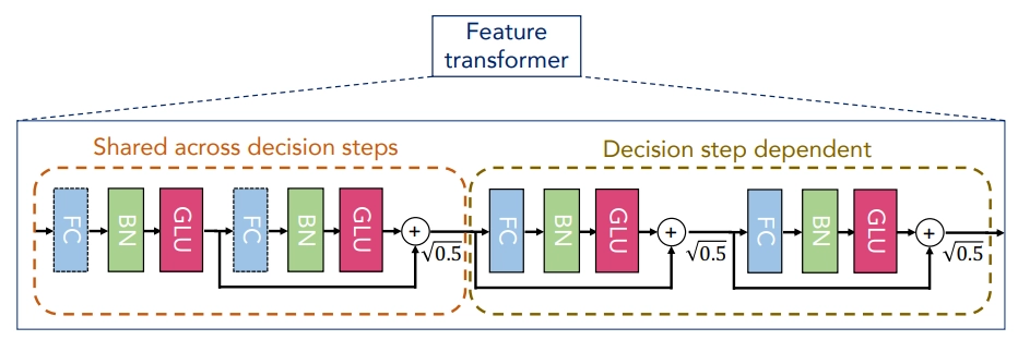 마스크에 의해 선택된 feature는 마스크에 feature vector를 곱한 로 표현됩니다. 그리고 feature transformer decision step은 아래와 같습니다.
