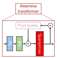 또한 softmax 대신 sparsemax를 활성함수로 사용하여 각 decision step마다 중요도가 떨어지는 feature에 learning capacity가 낭비되지 않도록 했습니다. 그리고 prior scale term()을 통해 이전 decision step의 feature 재선택 비율을 조절합니다.